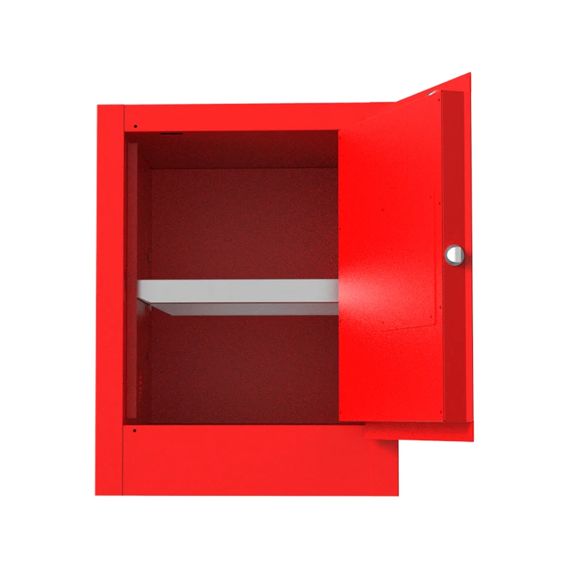 Кабинетот за складирање со запалива хемикалија е конструиран со двослојна челична плоча, што во голема мера ја подобрува цврстината и стабилноста на телото на кабинетот. Во индустриското производство, кога се соочуваме со често ракување и судири, може да обезбеди сигурна физичка заштита за запаливите хемикалии складирани внатре, спречувајќи потенцијални опасности предизвикани од истекување на запаливи предмети поради оштетување на кабинетот. Погоден е за места како што се складишта за хемиски суровини.