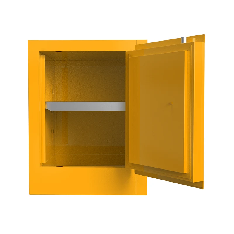Име на производ: Кабинет за складирање запалив Модел на производ: GS004 Надворешни димензии: В560×Ш430×Д430мм Внатрешни димензии: В460×Ш350×Д330мм Димензии на полицата: Ш348×Д330×В25мм Волумен: 4/15 (галони/литри) Тежина: 25 кг Начин на отворање на вратата: рачно/автоматско Полици: Една прилагодлива полица Тип на врата: Единечна врата Уред за заклучување: двојни брави Боја: Жолта (спреј со епоксидна смола - бојадисана) Забелешки: Според шишињата со реагенси од 500 ml, може да се постават 2 полици, со 9 шишиња на секоја полица |