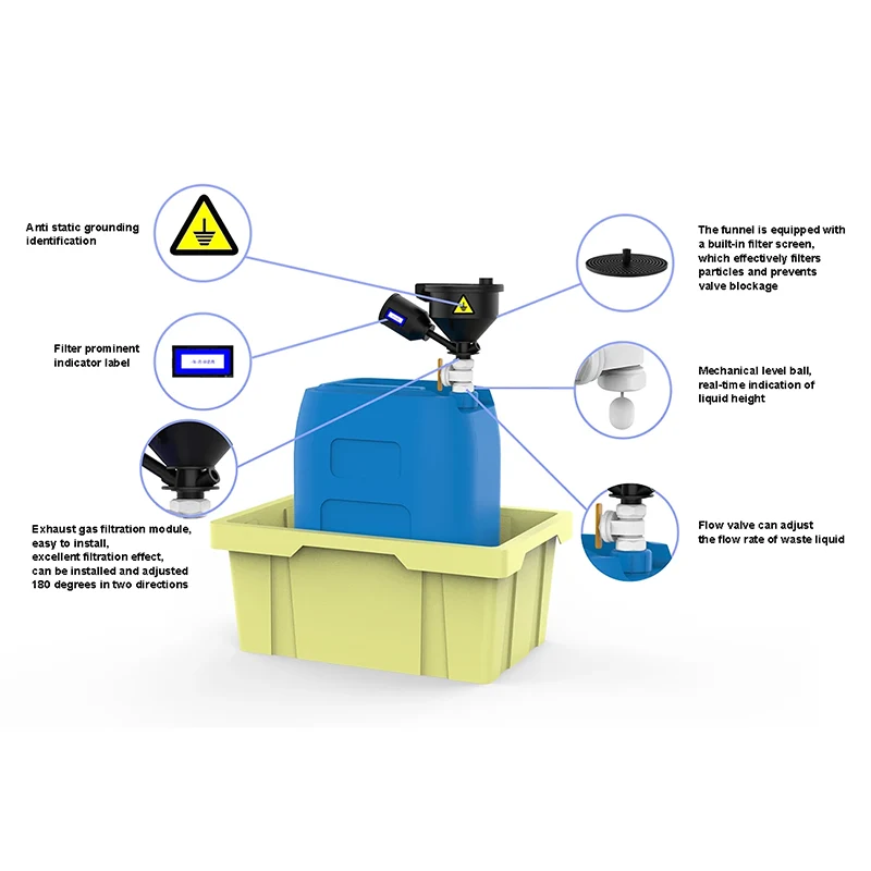Уредот за собирање отпадна течност има извонредни карактеристики. Неговиот контејнер за собирање е направен од увезени антистатички ПП суровини, кои не само што ја обезбедуваат стабилноста на материјалот, туку и ефикасно ја извршува функцијата на антистатичкиот агенс, контролирајќи го статичкиот електрицитет на инка за отпадна течност во опсег од 10^5 до 10^9, што значително го намалува ризикот од катастрофи предизвикани од статички електрицитет. Инката има софистициран дизајн. Горниот капак отпорен на протекување е поврзан со капакот за запечатување и филтерската инка отпорна на прскање, а може да се инсталира вентил по потреба за да се осигура безбедноста на складирањето на отпадните течности. Горниот капак од типот противтежа автоматски ја прилагодува емисијата на издувни гасови според условите на внатрешниот притисок на отворање на 100Pa и затворање на 50Pa, избегнувајќи експлозија и спонтано согорување. Филтерот за издувни гасови е поврзан на спирален начин, што е погодно за замена и спречува испарување на хемиските компоненти. Достапни се 5 различни типови за прецизно прилагодување на различни третмани на издувните гасови.